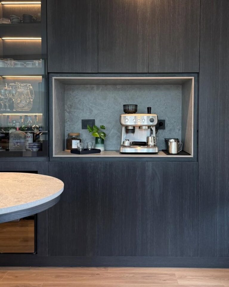 I see this coffee station as a clean cut into a dark cabinet wall. The niche is framed in composite, which gives it weight and durability without introducing visual noise. Everything stays inside the cabinet plane, with the espresso machine centered and small accessories pushed to the side. The material choice makes sense here. Composite handles heat, moisture, and daily use better than wood. This works best in kitchens where the coffee station needs to disappear when not in use but still feel intentional when open.