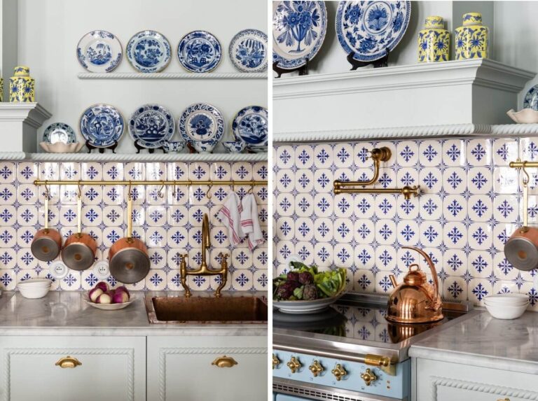 Texture becomes a design language, where vintage patterns and hand-painted motifs replace the flat uniformity of standard grids. Sage green cabinetry, unlacquered brass hardware, and a Swedish-inspired palette are layered to provide a sense of elegance and ease.