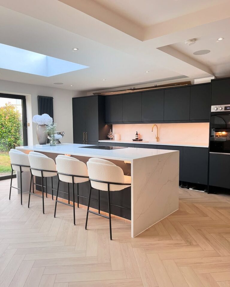 These island chairs combine comfort with a restrained profile, using thin cushions and open metal frames. They reinforce the clean geometry of the island without overpowering it. The contrast sharpens the modern character of the kitchen.