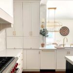 Gold accents on the range and hardware introduce contrast in controlled points. The textured backsplash adds movement, preventing the white surfaces from blending together.