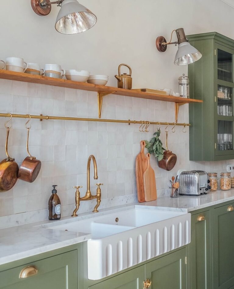 Soft White Zellige With Brass Rail and Sage Cabinetry