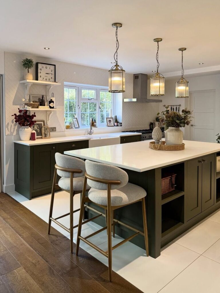 This island moves beyond a closed block and turns its base into visible storage. Books, everyday items, and small objects stay within reach while adding color and variation to the kitchen. The green cabinetry sets a strong base, giving the island enough presence to hold all that detail without looking cluttered.