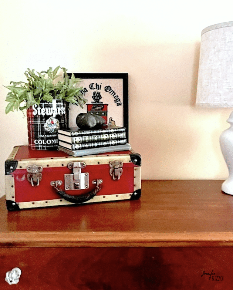 Decorating with vintage suitcases, a red and beige vintage trunk sits on a wooden dresser topped with books, a plaid tin filled with greenery, a framed sign, and part of a white lamp visible on the right.