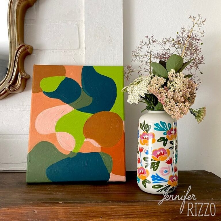 Easy line fill abstract art with green, peach, and navy shapes sits on a dark wood shelf next to a floral-patterned vase holding assorted flowers.