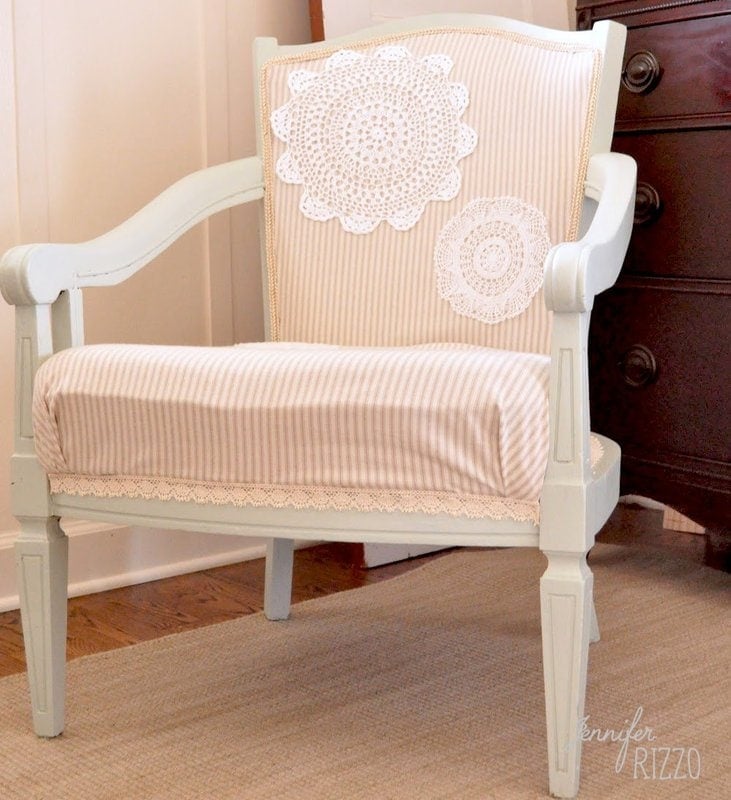 I love how the vintage doilies in two difference sizes really play against each other and add interest with the striped fabric. It really gives it a sweet cottage feel with the light blue chair frame.