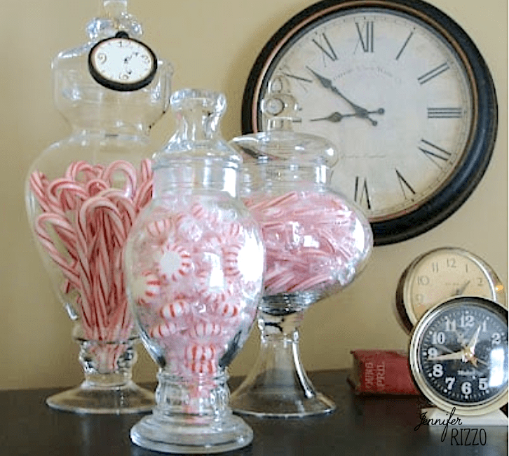 Different types of Peppermint candy in beautiful Apothecary jars is a great vase filler idea! It’s a pretty and inexpensive way to decorate for the holidays. Shop similar apothecary jars here.