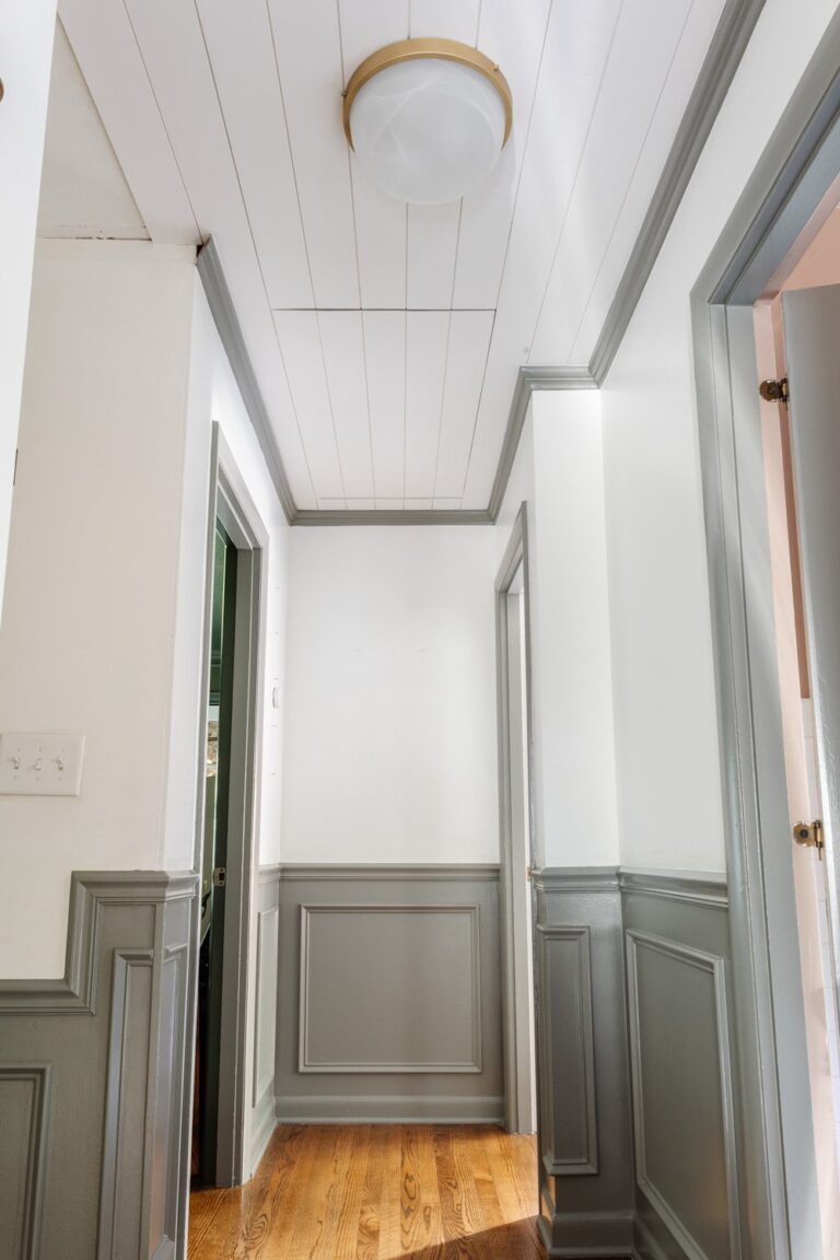 Now that our tongue and groove ceiling is in place and the attic door is completely hidden, our hallway feels taller, cleaner, and way more intentional.