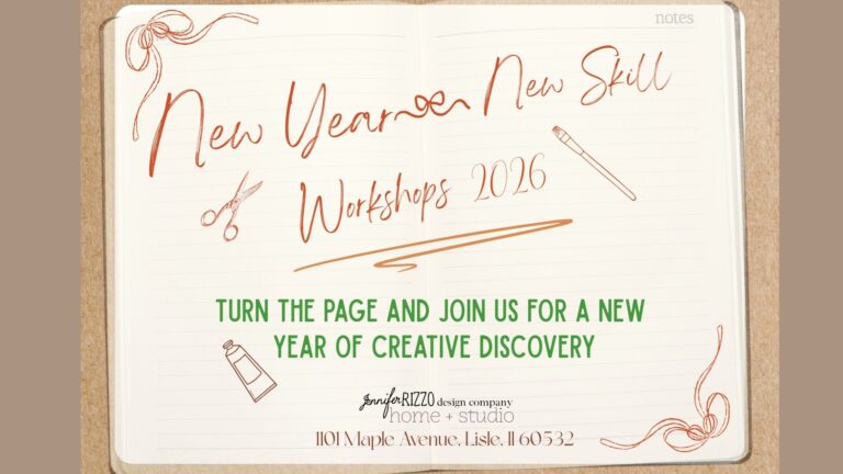 Flyer for a "Drop In Word of the Year Canvas" event on Friday, January 2nd, 10:30 am–3:30 pm at Jennifer Rizzo Home + Studio, Lisle, IL. Register at shopjenniferrizzo.com.