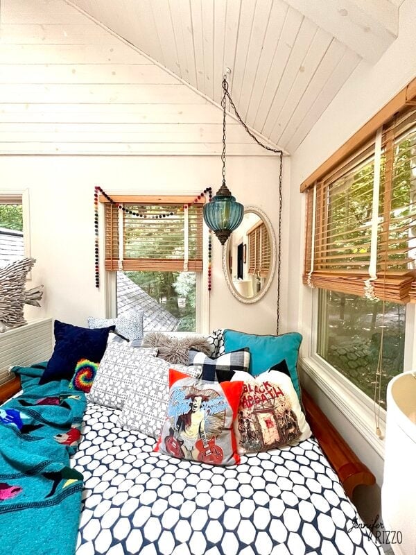 Bright, cozy room with a daybed covered in patterned pillows, surrounded by windows with wooden blinds, a rug, side table with books, and a hanging lamp in a Restyled Eclectic Loft Living Area