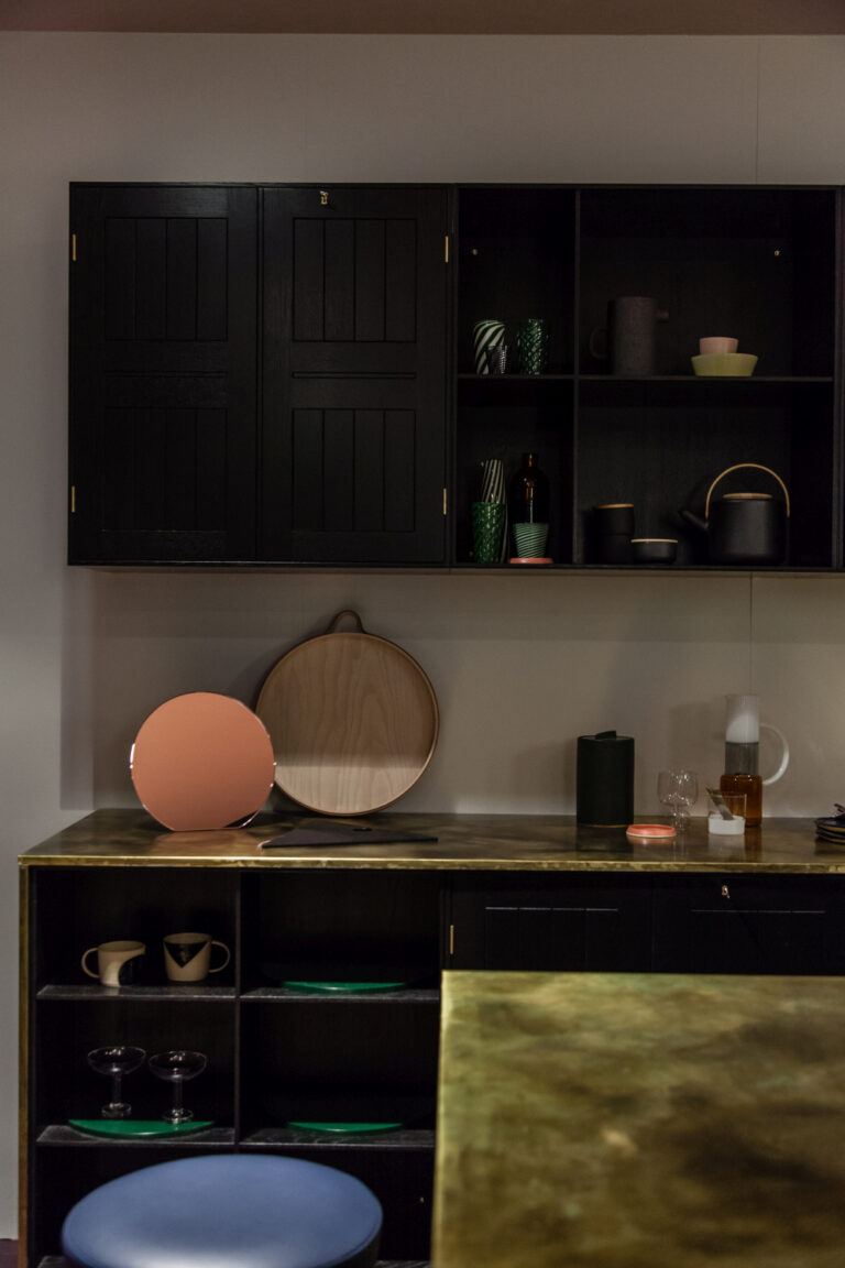 The island and perimeter countertops are wrapped in unlacquered brass. It will scratch, darken, and develop patina. That is intentional. Rather than fighting wear, the surface records it. Paired with matte black cabinetry, the warmth of the metal feels grounded instead of flashy. The vertical panel detailing adds texture and prevents the dark casework from reading flat.